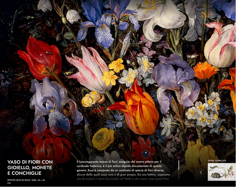 Un’installazione multimediale dedicata a Jan Brueghel e al Cardinale Borromeo realizzata in partnership con Black Srl, per offrire un’esperienza digitale che unisce arte, scienza e spiritualità. Grazie a tre schermi touch interattivi, i dipinti si rivelano nei dettagli più nascosti, immergendo il visitatore in un percorso interattivo tra bellezza, conoscenza e meraviglia.